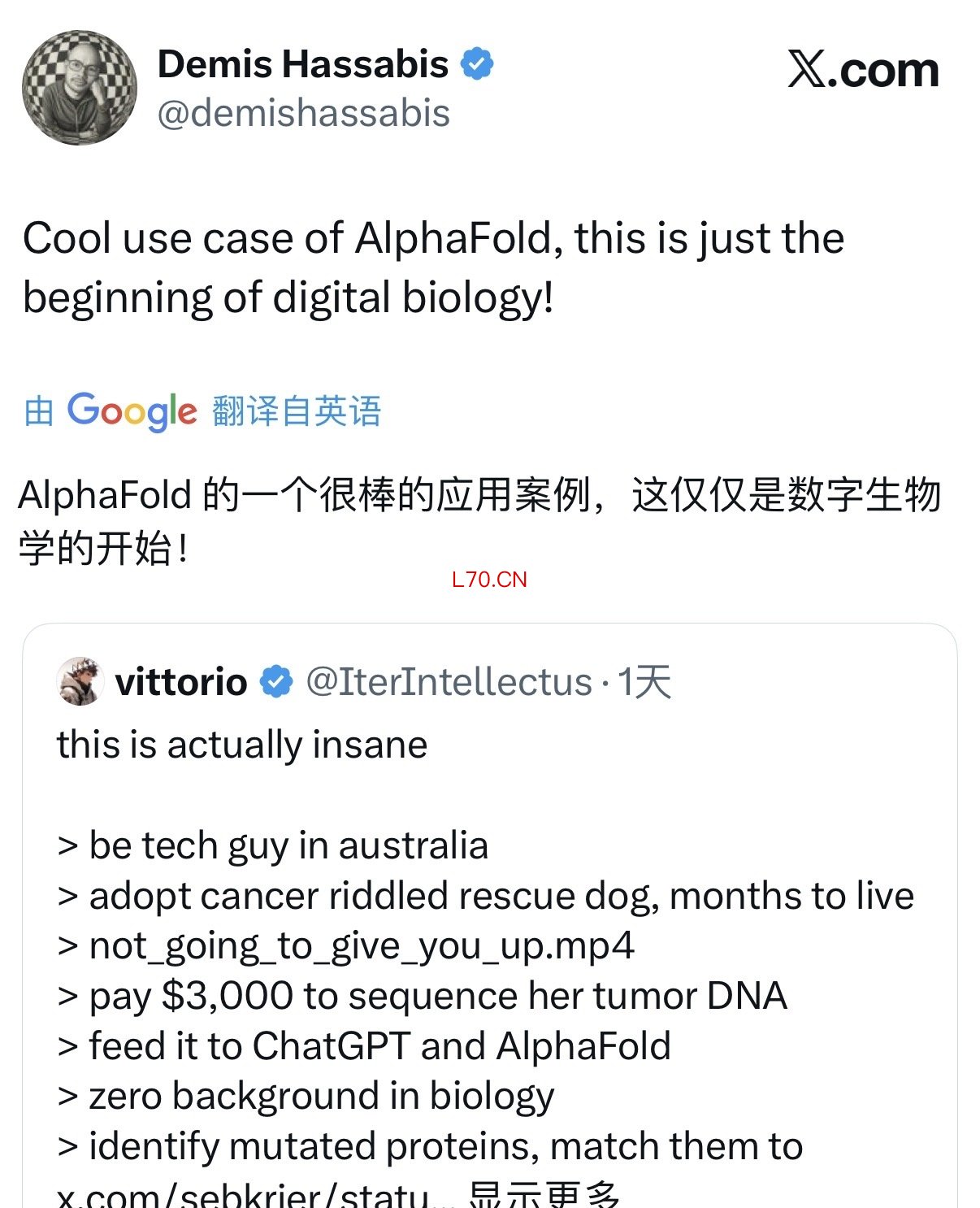 众多科技圈大佬纷纷转发点赞。谷歌DeepMindCEO哈萨比斯(Demis Hassabis)认为,这是AlphaFold的一个很好的应用案例,“仅仅是数字生物学的开始”,马斯克也跟帖表示认可。OpenAI总裁格雷格·布罗克曼(Greg Brockman)表示,这是首款专为犬类设计的个性化癌症疫苗,“窥见通用人工智能机遇的一角”。