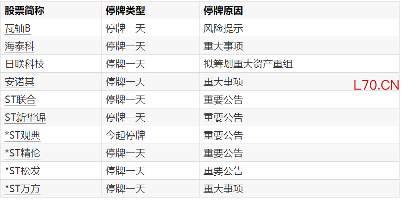 A股停牌提示:10股今日停牌
