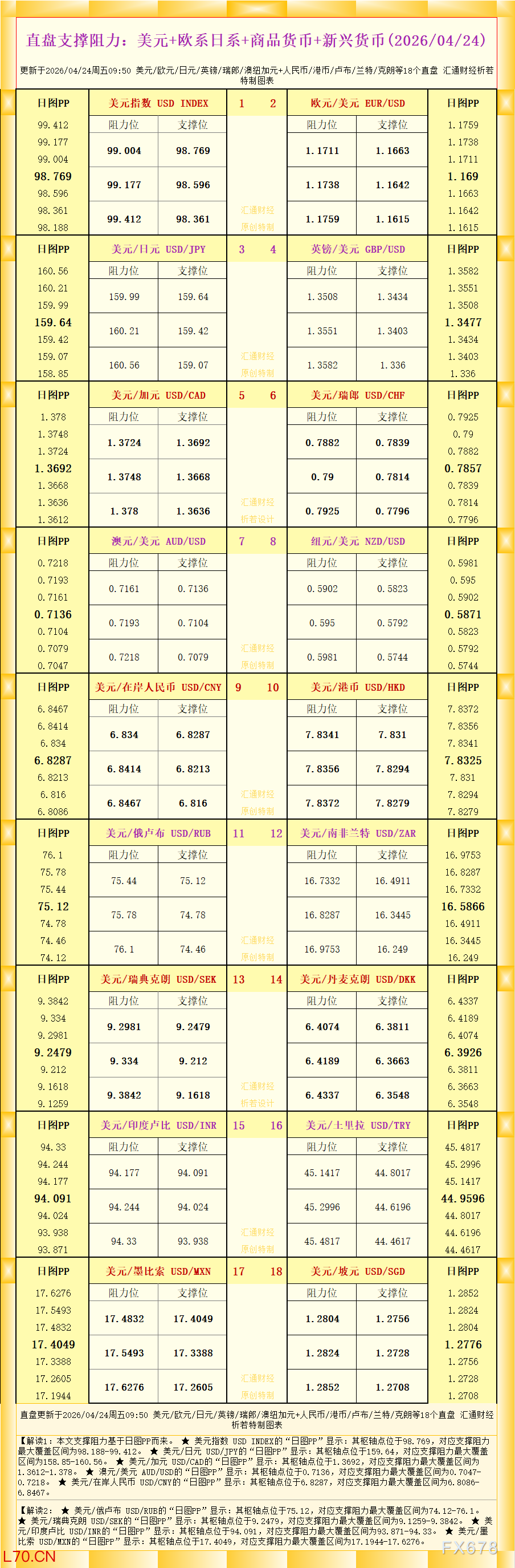 汇通财经APP讯——一张图看直盘支撑阻力:美元+欧系日系+商品货币+新兴货币,更新于2026年4月24日周五09:50,具体美元/欧元/日元/英镑/瑞郎/澳纽加元+人民币/港币/卢布/兰特/克朗等18个直盘,更多详见汇通财经析若特制图表中的内容。